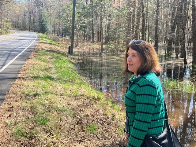 James City Vice Chair Ruth Larson took Williamsburg Watch on a tour of the area, where beavers have put up a dam spanning the wetland’s frontage with Route 5 and appear to have overwhelmed devices installed to keep water flowing into Powhatan Creek.