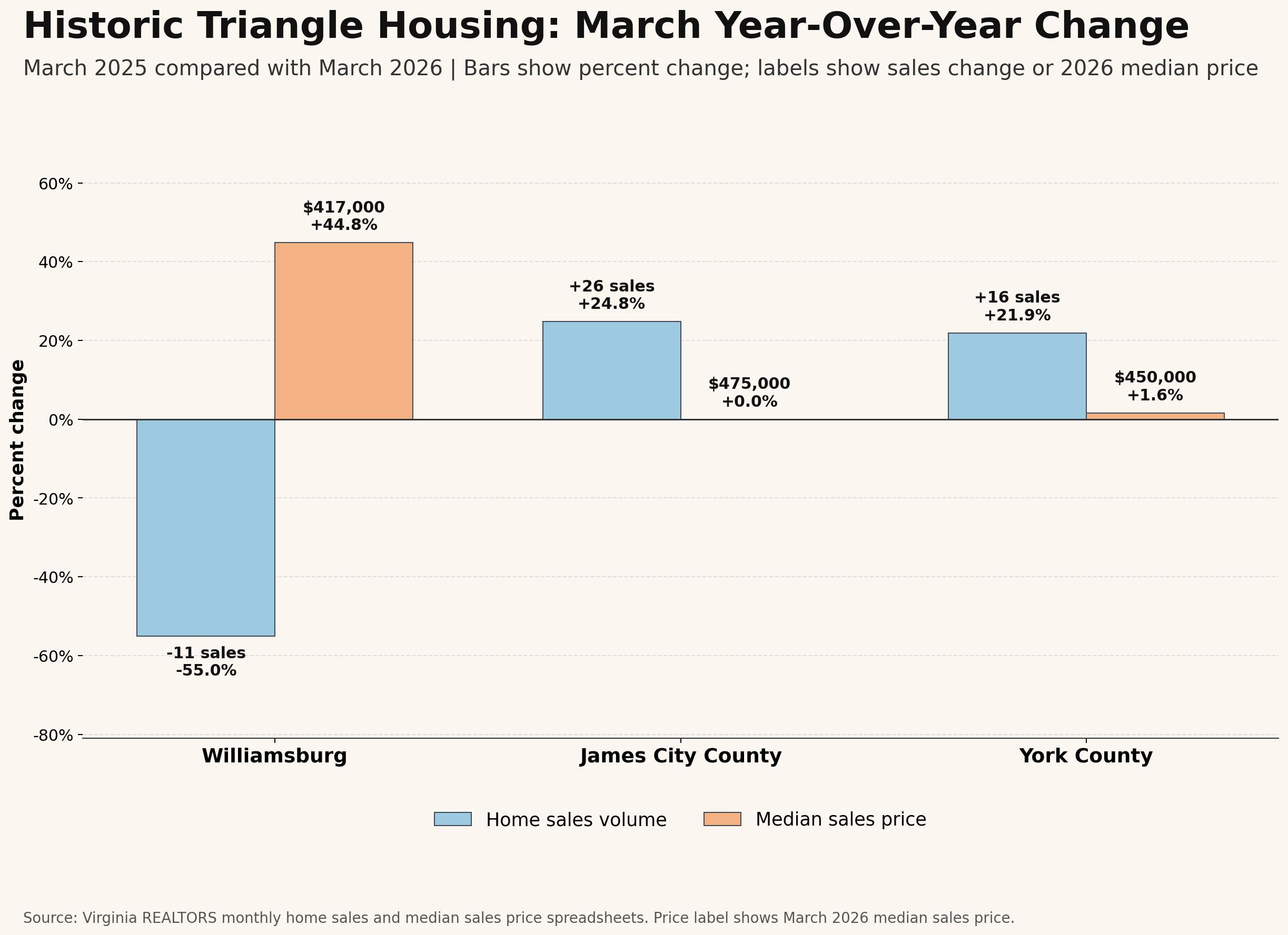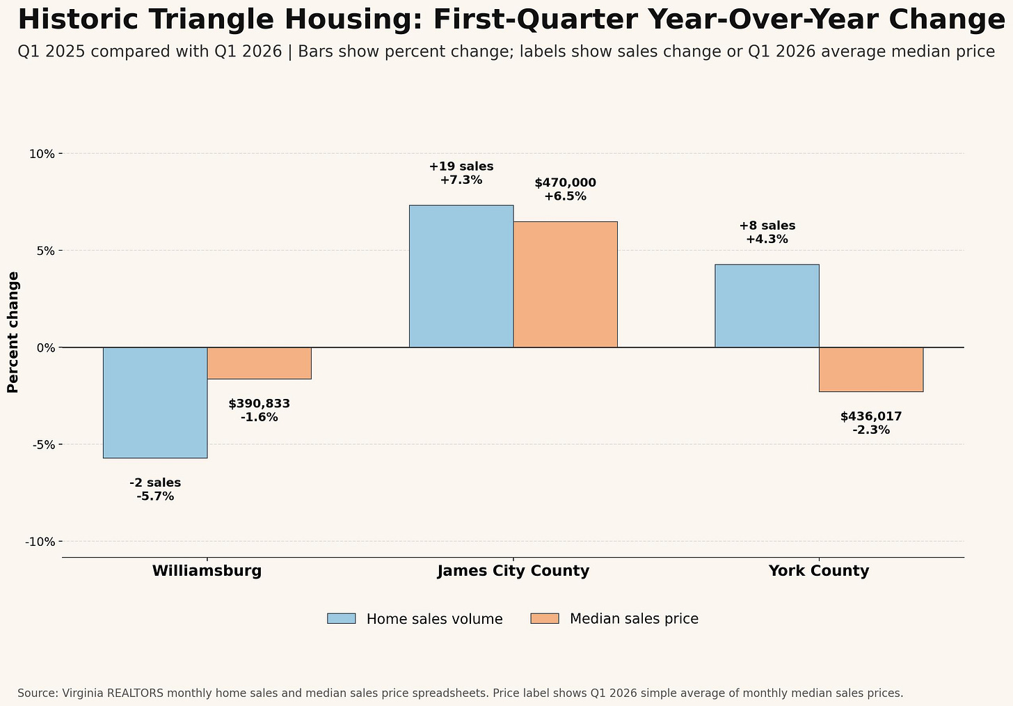 For the first three months of this year, James City County had the largest increase in home sales, up 19% from the first quarter of 2025. The county’s median home sales price increased 7.3% in that time.