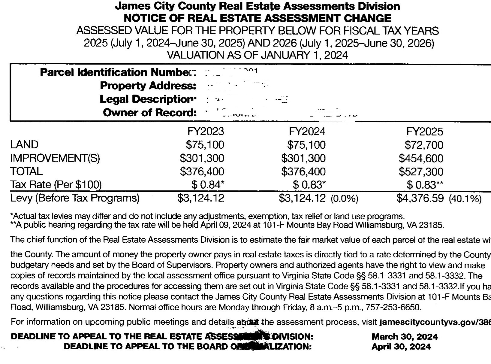 The average James City homeowner’s tax bill increased 21% over the past two years, even though the tax rate was unchanged, because of rising property values.