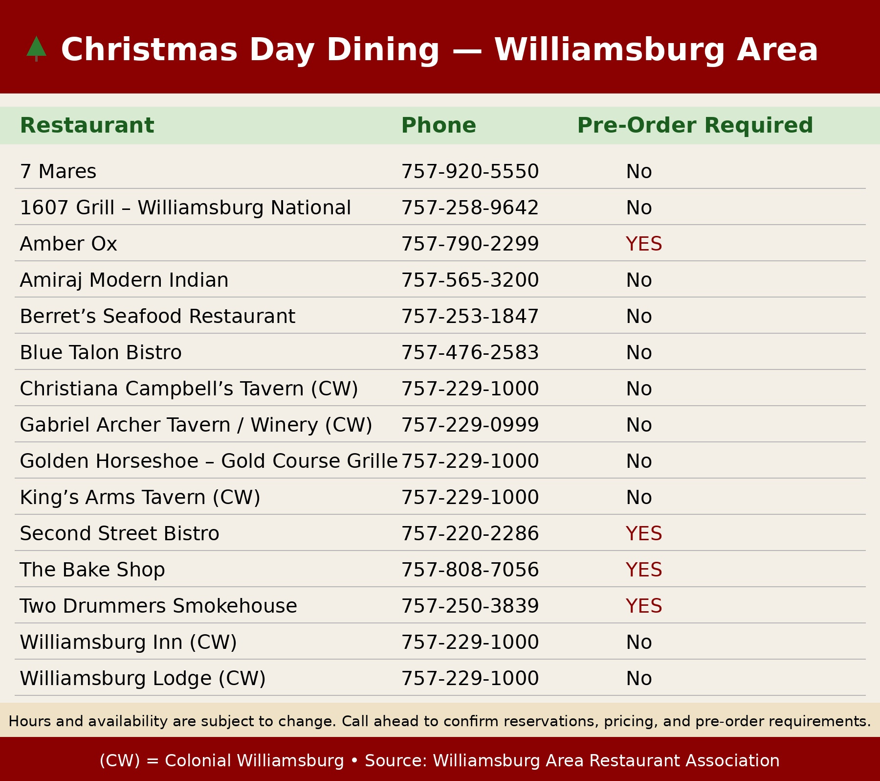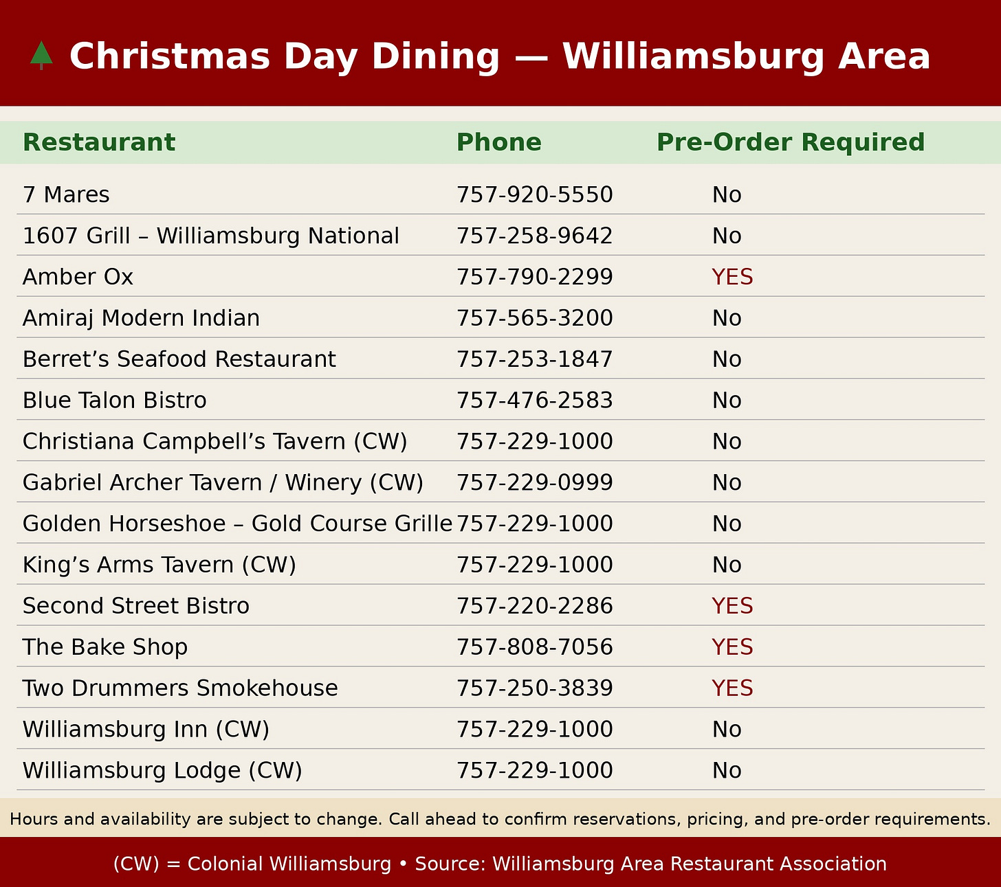 Changed your mind about cooking Christmas dinner? Here’s our list of Williamsburg area restaurants that will be open Christmas day: