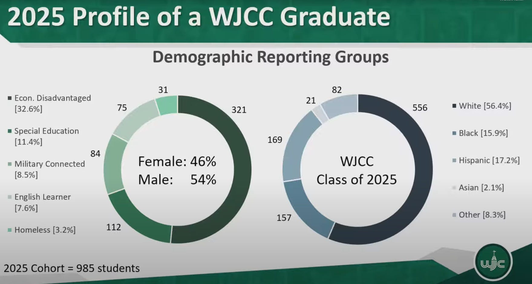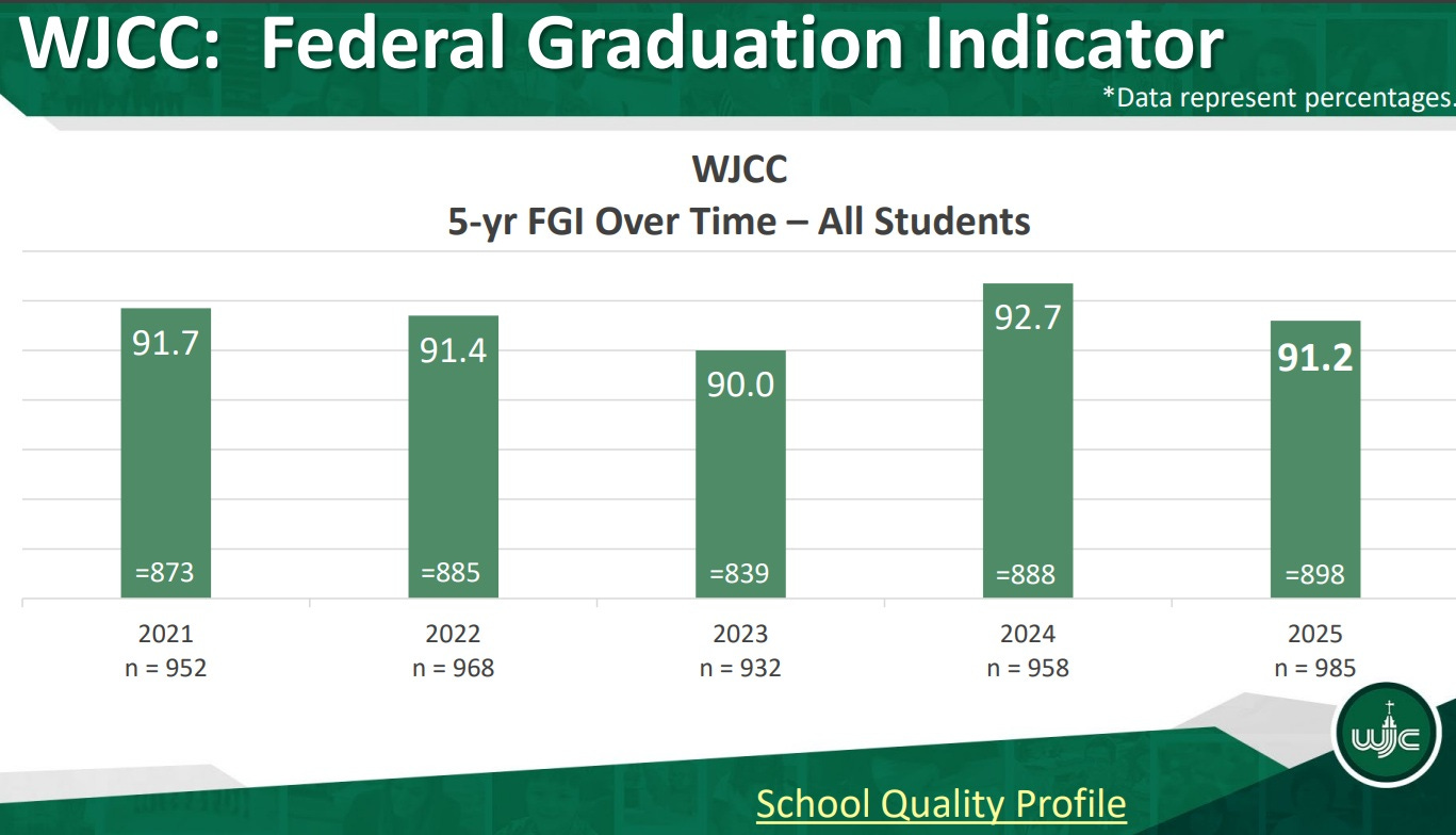 The state scores he shared show W-JCC’s three high schools slipped slightly in the percentage of students who graduated on time last year — defined as those who graduate four years after entering 9th grade.
