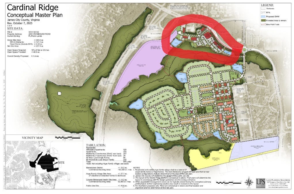 The mixed-use project, called Cardinal Ridge, is the brainchild of national homebuilder D.R. Horton. It would be located on 365 acres between Ironbound Road and Galt Lane.