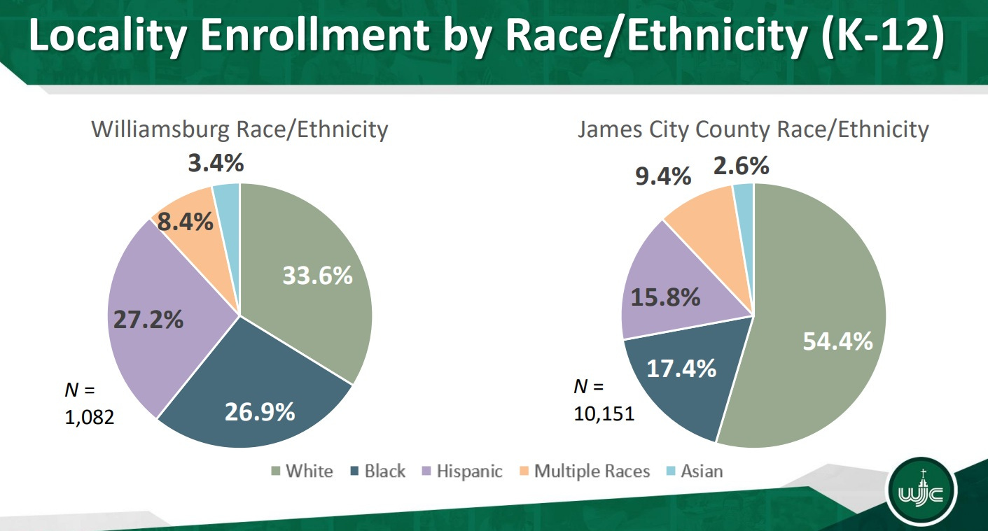 While white students are the largest single group in both areas, they represent more than half of James City County students, and only a third of Williamsburg’s. Black and Hispanic students make up a larger percentage of Williamsburg’s student body.